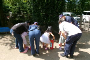 消火器の使い方もチェック!いざというときにきちんと動けるよう訓練します。